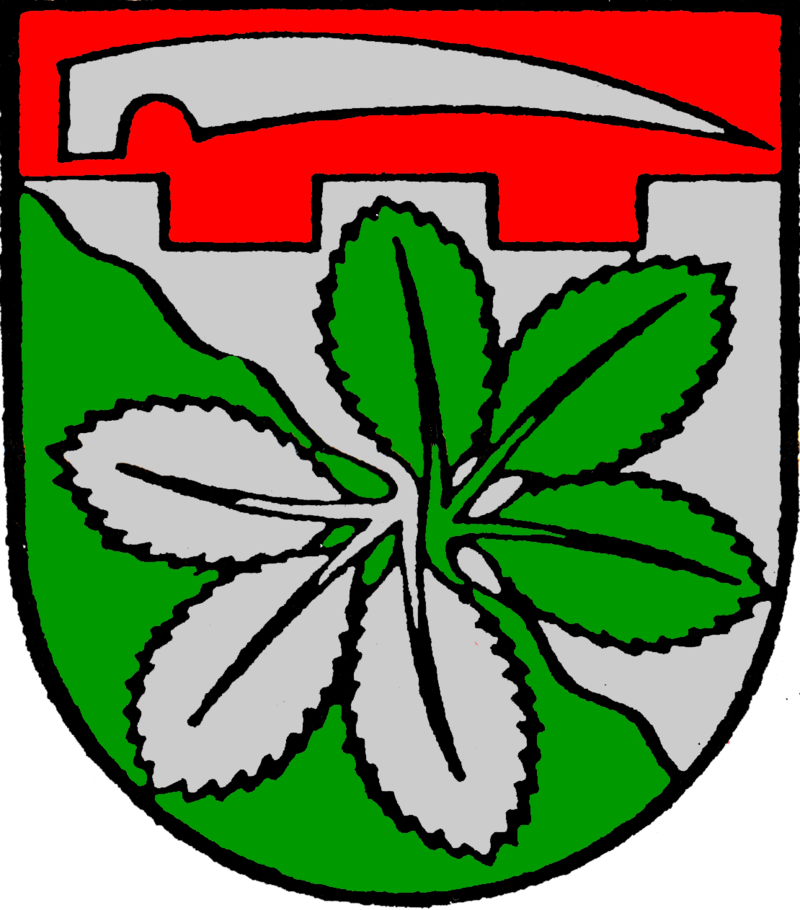 zeigt einen roten Zinnenschildhaupt zu drei Zinnen, deren äußere aus dem Schildrand hervorgehen, ein silbernes Sensenblatt, unter dem Schildhaupt im wellenschnittartig von silber und grün schräg geteilten Schilde, oben und unten in verwechselten Farben, je einen aus der Wellenteilung ausgezogenen Buchenzweig zu drei Blättern.